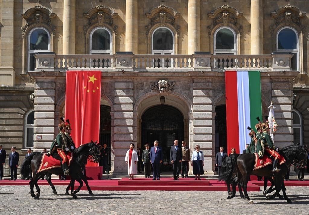 初夏時(shí)節(jié)的布達(dá)佩斯陽(yáng)光明媚,古老宏偉的布達(dá)王宮莊嚴(yán)矗立,中匈兩國(guó)國(guó)旗相映成輝。習(xí)近平和夫人彭麗媛乘坐的國(guó)賓車隊(duì)在匈牙利禮賓馬隊(duì)護(hù)衛(wèi)下緩緩駛?cè)氩歼_(dá)王宮內(nèi)庭。舒尤克總統(tǒng)夫婦和歐爾班總理夫婦熱情迎接。