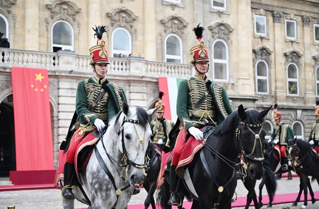 當(dāng)?shù)貢r(shí)間5月9日上午,國(guó)家主席習(xí)近平在布達(dá)佩斯出席匈牙利總統(tǒng)舒尤克和總理歐爾班共同舉行的隆重歡迎儀式。習(xí)近平在舒尤克陪同下檢閱國(guó)防軍儀仗隊(duì)和騎兵儀仗隊(duì)。