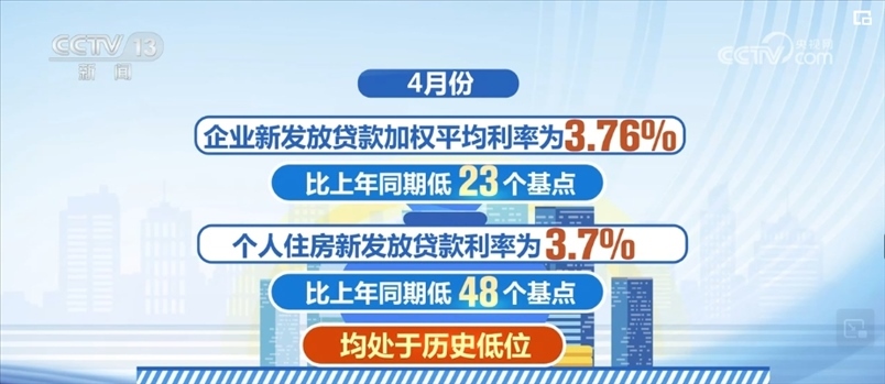 4月份,企業(yè)新發(fā)放貸款加權(quán)平均利率為3.76%,比上年同期低23個基點;個人住房新發(fā)放貸款利率為3.7%,比上年同期低48個基點,均處于歷史低位。