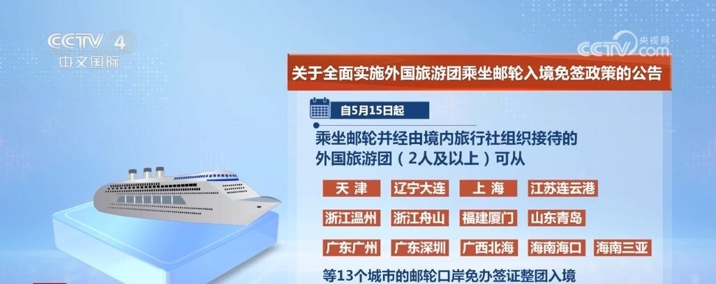 央視網(wǎng)消息:中國國家移民管理局發(fā)布公告,為進一步促進便利外籍人員來華旅游,自5月15日起,在中國沿海省份全面實施外國旅游團乘坐郵輪入境免簽政策,乘坐郵輪來華并經(jīng)由境內(nèi)旅行社組織接待的外國旅游團可從中國沿海所有郵輪口岸免辦簽證入境停留15天。