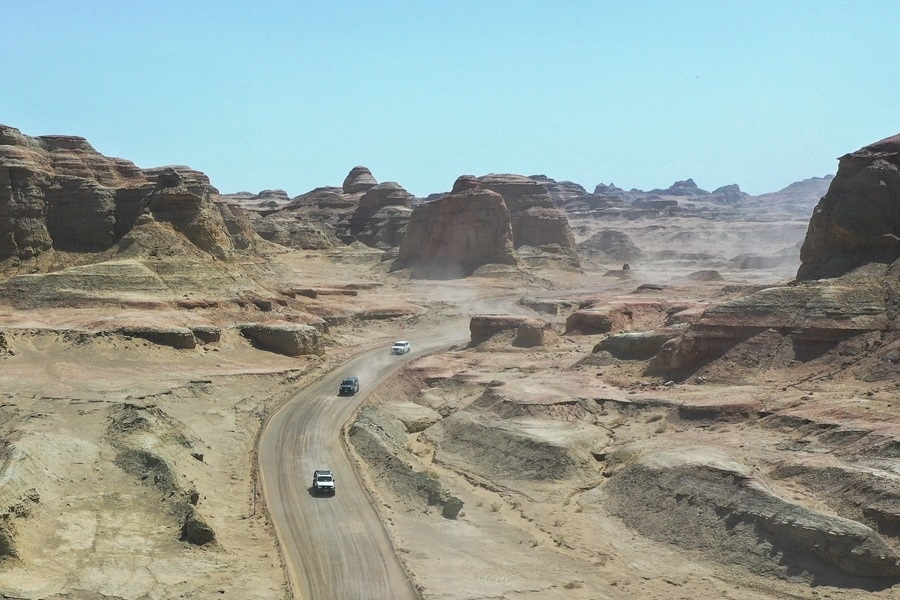 在新疆克拉瑪依市烏爾禾區(qū)世界魔鬼城景區(qū),車友在自駕線路上疾馳(5月1日攝,無(wú)人機(jī)照片)。新華社記者 丁磊 攝