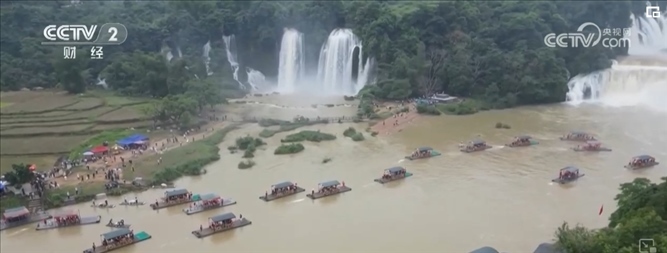 水量大增的瀑布奔騰而下沖擊著河面水聲轟鳴,慕名前來的游客們或乘坐竹筏感受瀑布的恢弘氣勢(shì),或?qū)ふ易罴褭C(jī)位與瀑布“打卡”合影。除了近距離觀賞德天跨國(guó)瀑布,也有不少游客選擇跨境游玩,站在越南境內(nèi)的板約瀑布看德天瀑布,以不同視角體驗(yàn)中越風(fēng)情。