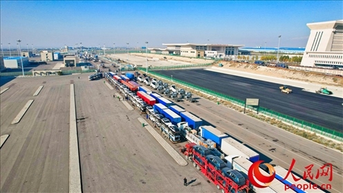 霍爾果斯公路口岸,等待通關(guān)的汽車(chē)。人民網(wǎng) 李欣洋攝