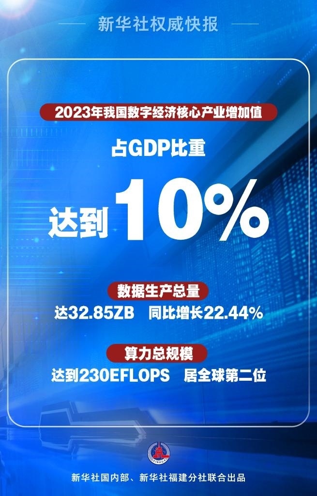 2023年我國數字經濟保持穩(wěn)健增長,數字經濟核心產業(yè)增加值占GDP比重達到10%。數據要素市場日趨活躍,2023年數據生產總量達32.85ZB(1個ZB等于十萬億億字節(jié)),同比增長22.44%。數字基礎設施不斷擴容提速,算力總規(guī)模達到230EFLOPS(EFLOPS是指每秒百億億次浮點運算次數),居全球第二位。