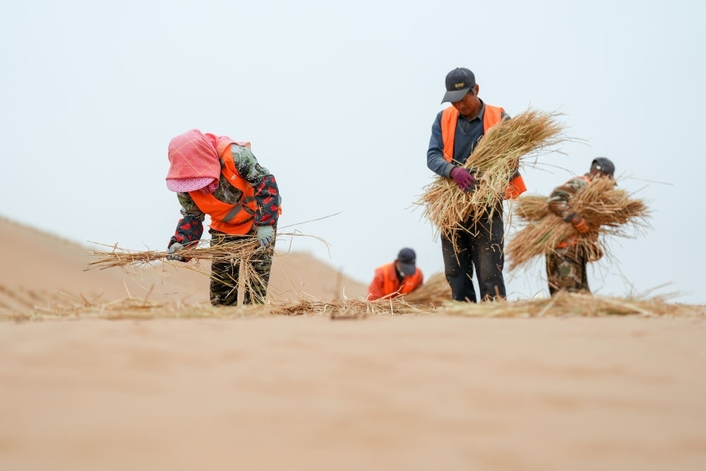 ?2024年4月27日,在內(nèi)蒙古阿拉善左旗騰格里沙漠S315沿線固沙工程現(xiàn)場(chǎng),治沙工人用稻草在沙漠中扎草方格。新華社記者 連振 攝
