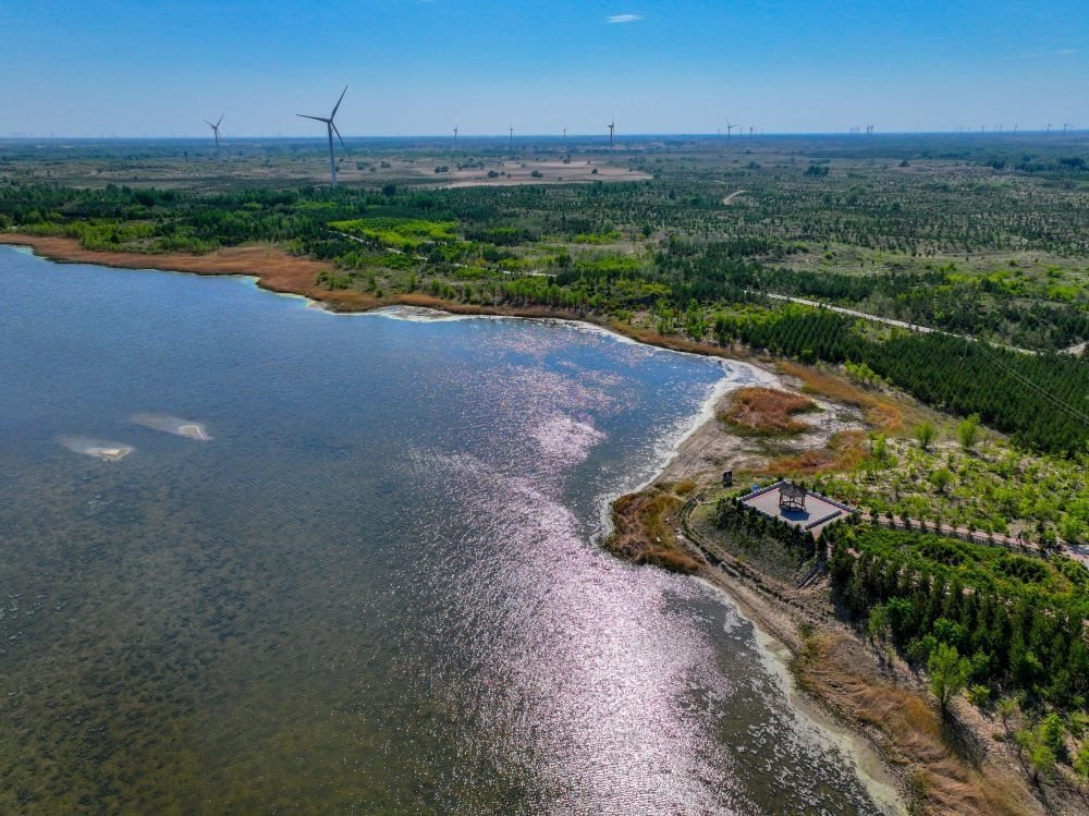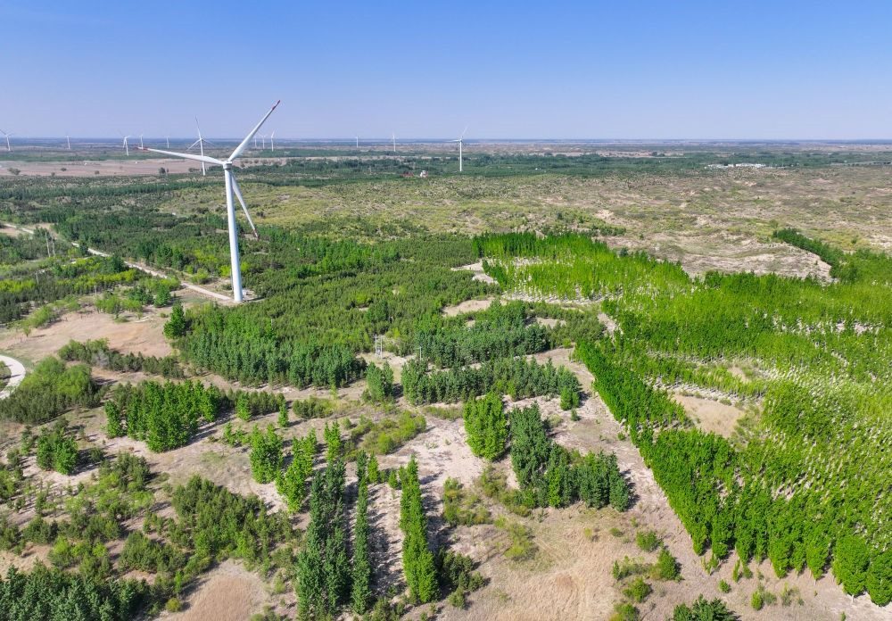 ?這是在內(nèi)蒙古通遼市科爾沁沙地“雙百萬(wàn)畝”綜合治理工程努古斯臺(tái)項(xiàng)目區(qū)拍攝的風(fēng)力發(fā)電機(jī)組(2024年5月15日攝,無(wú)人機(jī)照片)。新華社記者 連振 攝