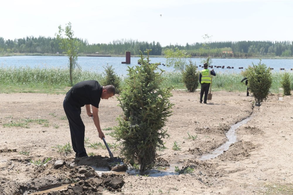 ?2024年4月23日,在地處黃河“幾字彎”的內(nèi)蒙古巴彥淖爾市臨河區(qū),新華林場(chǎng)職工給新栽種的樹木澆水。新華社記者 李云平 攝