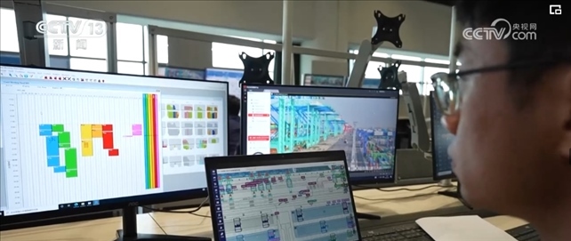 作為系統(tǒng)優(yōu)化師,范春奇全神貫注地盯著3個屏幕。左邊屏幕是碼頭調(diào)度指令,右邊是現(xiàn)場監(jiān)控的實(shí)時畫面,中間是智能水平運(yùn)輸系統(tǒng),顯示著所有車輛的運(yùn)行軌跡。