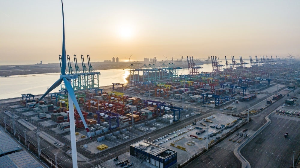 看似平常的碼頭作業(yè),背后卻另有玄機——整個過程達到了“零碳”排放。2021年底,隨著兩臺風(fēng)機葉片緩緩啟動,這座全球首個“智慧零碳”碼頭的智慧綠色能源系統(tǒng)開始并網(wǎng)發(fā)電,通過風(fēng)電、光伏發(fā)出的綠色能源,源源不斷為碼頭生產(chǎn)提供能源。
