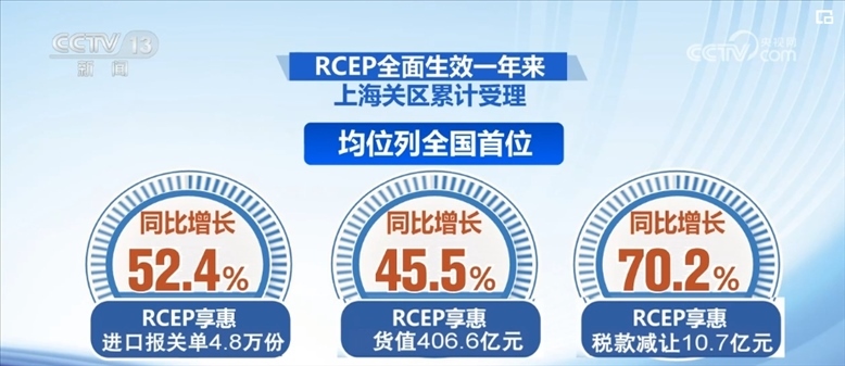 在上海,RCEP全面生效一年來(lái),上海關(guān)區(qū)累計(jì)受理RCEP享惠進(jìn)口報(bào)關(guān)單4.8萬(wàn)份,貨值406.6億元,稅款減讓10.7億元,均位列全國(guó)首位,同比分別增長(zhǎng)52.4%、45.5%和70.2%,