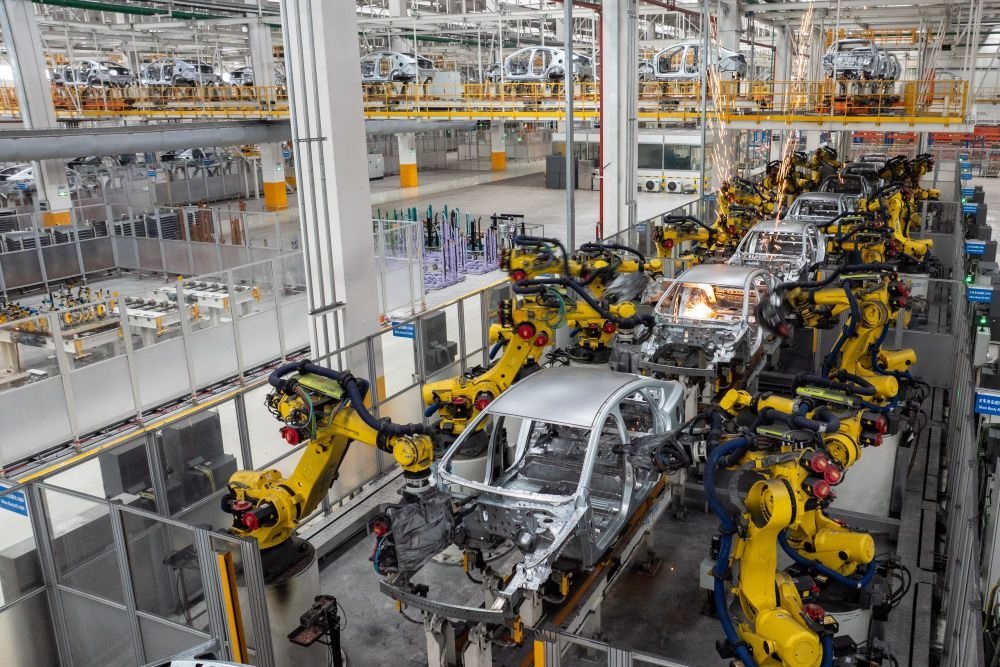 2024年3月21日,比亞迪湖南長沙雨花工廠機(jī)械臂在焊接車身。