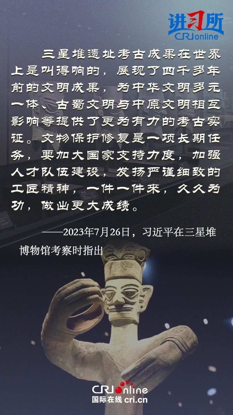 文物和文化遺產(chǎn)承載燦爛文明,傳承歷史文化,維系民族精神。三星堆博物館、殷墟遺址、敦煌研究院……這些年,習(xí)近平高度重視中華文明探源工程和文物保護(hù)工作,強(qiáng)調(diào)要把中華文明歷史引向深入,把中華優(yōu)秀傳統(tǒng)文化一代一代傳下去。
