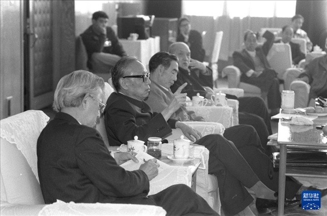 1991年4月6日,任建新同志(左二)參加七屆全國(guó)人大四次會(huì)議山西省代表團(tuán)小組會(huì),聽(tīng)取代表們對(duì)最高人民法院工作報(bào)告的意見(jiàn)。