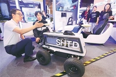 工作人員在二〇二四全球數(shù)字經(jīng)濟(jì)大會沉浸式體驗(yàn)區(qū)介紹自動駕駛無人車。陳曉根攝(人民視覺)