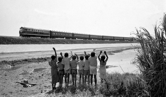 贊比亞魯西瓦西湖畔的少年兒童歡迎坦贊鐵路的列車(chē)通到他們的家鄉(xiāng)(1976年攝)。