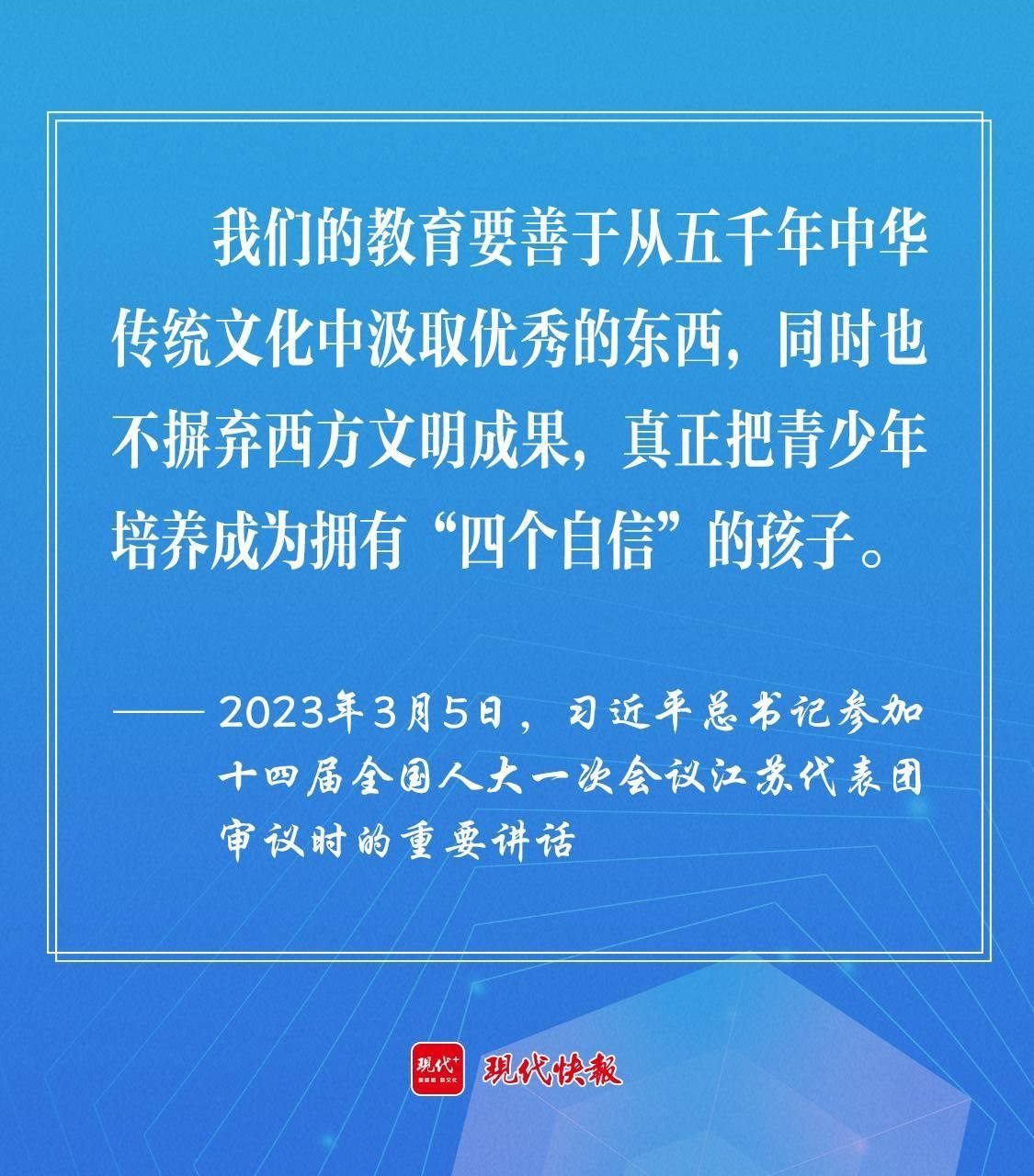 2023年3月5日,習(xí)近平總書記參加十四屆全國(guó)人大一次會(huì)議江蘇代表團(tuán)審議時(shí),勉勵(lì)教育工作者“要善于從五千年中華傳統(tǒng)文化中汲取優(yōu)秀的東西,同時(shí)也不摒棄西方文明成果,真正把青少年培養(yǎng)成為擁有‘四個(gè)自信’的孩子。”