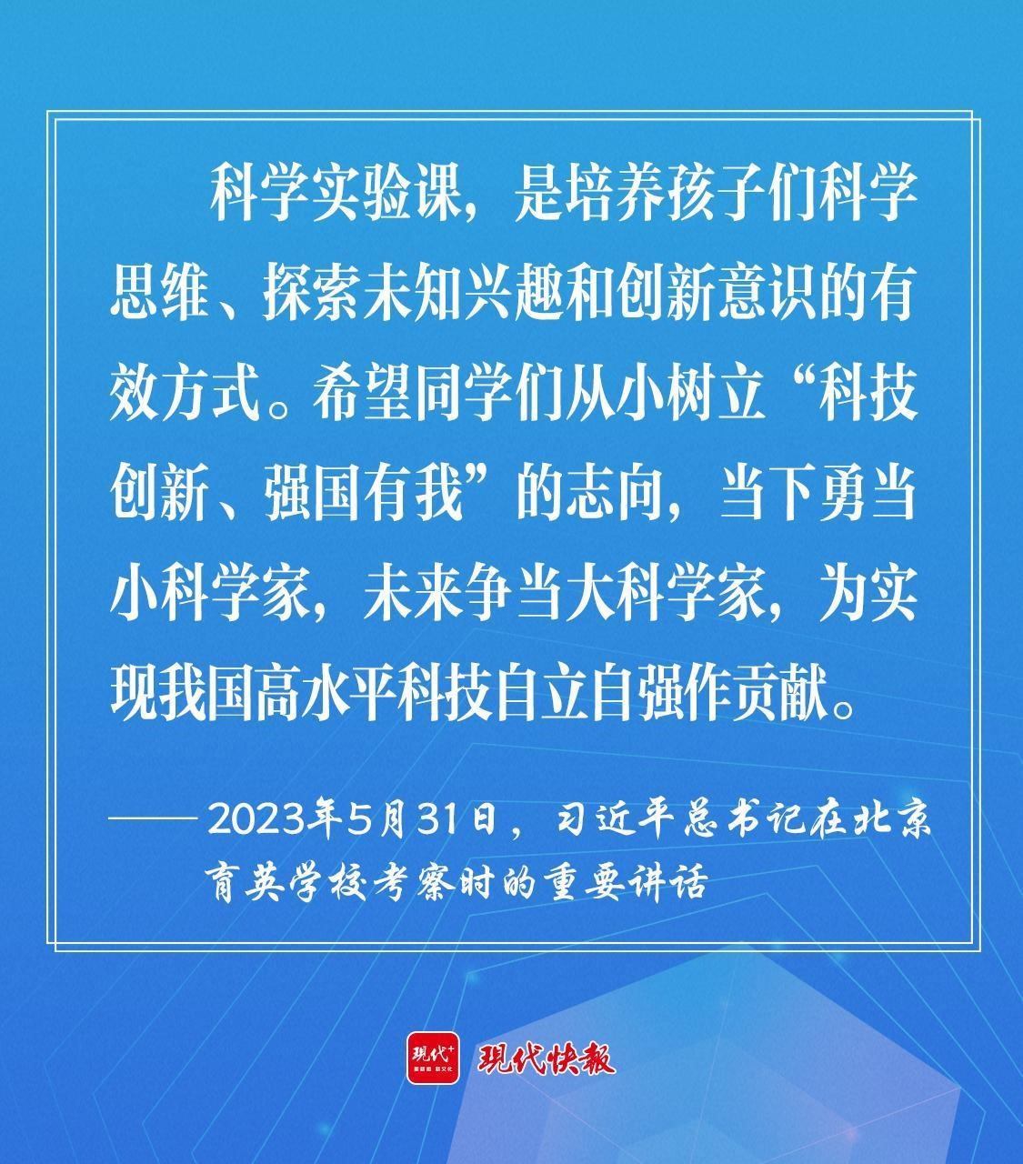 2023年5月,習(xí)近平總書記在北京育英學(xué)校考察時(shí)強(qiáng)調(diào),希望同學(xué)們從小樹立“科技創(chuàng)新、強(qiáng)國(guó)有我”的志向,當(dāng)下勇當(dāng)小科學(xué)家,未來爭(zhēng)當(dāng)大科學(xué)家,為實(shí)現(xiàn)我國(guó)高水平科技自立自強(qiáng)作貢獻(xiàn)。