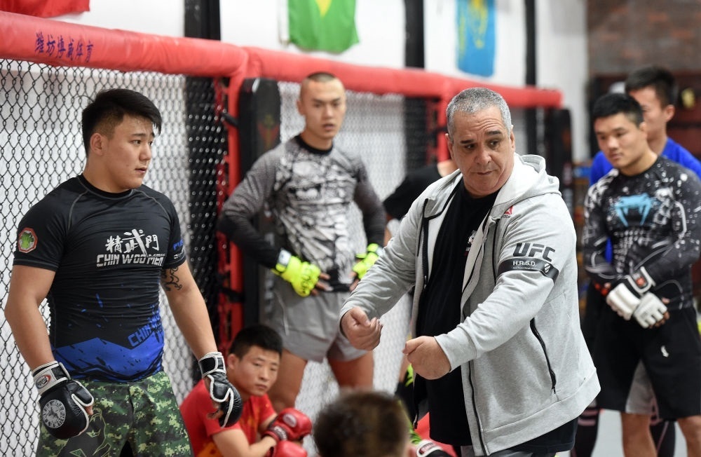 2019年11月6日,來自巴西里約熱內盧的柔術教練魯伊·梅內賽斯在北京一家搏擊館講解動作要領。