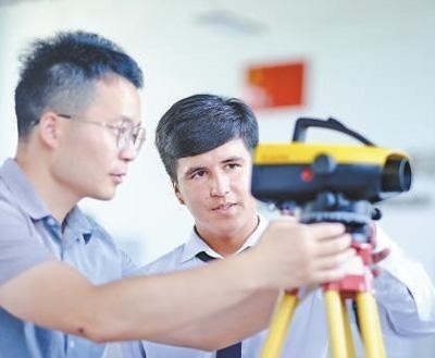 心聯(lián)通在塔吉克斯坦首都杜尚別的魯班工坊,來(lái)自天津城市建設(shè)管理職業(yè)技術(shù)學(xué)院的老師(左)為當(dāng)?shù)貙W(xué)生提供指導(dǎo)。新華社記者 鄭開君攝