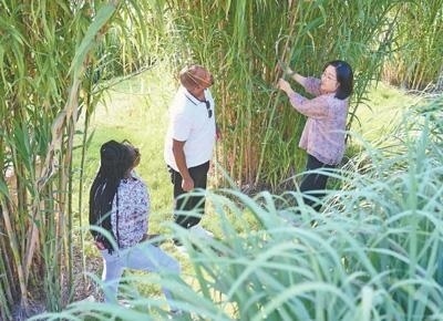 心聯(lián)通福建農(nóng)林大學(xué)國(guó)際菌草工程技術(shù)研究中心工作人員(右)在向盧旺達(dá)留學(xué)生介紹菌草品種“綠洲1號(hào)”蘆竹的生長(zhǎng)情況。新華社記者 林善傳攝