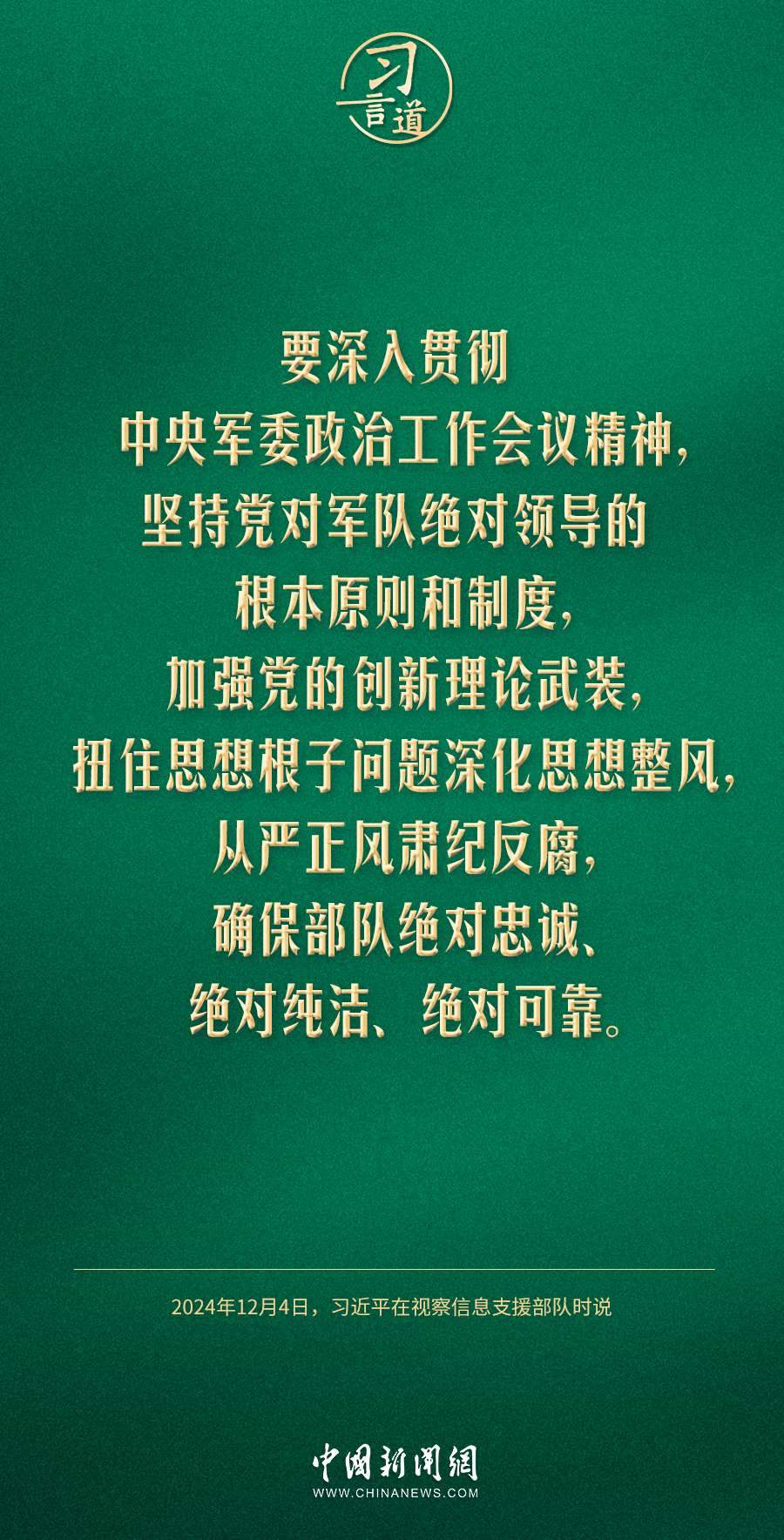 中共中央總書記、國家主席、中央軍委主席習(xí)近平4日視察信息支援部隊,代表黨中央和中央軍委,對信息支援部隊第一次黨代表大會的召開表示熱烈祝賀,向信息支援部隊全體官兵致以誠摯問候。習(xí)近平指出——