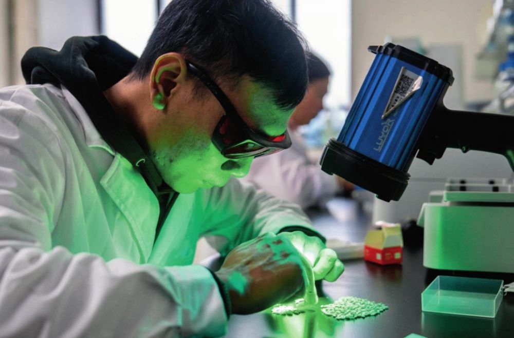 在湖南雜交水稻研究中心,工作人員通過熒光法進(jìn)行水稻樣本分析(2024年11月25日攝)。陳思汗攝/本刊