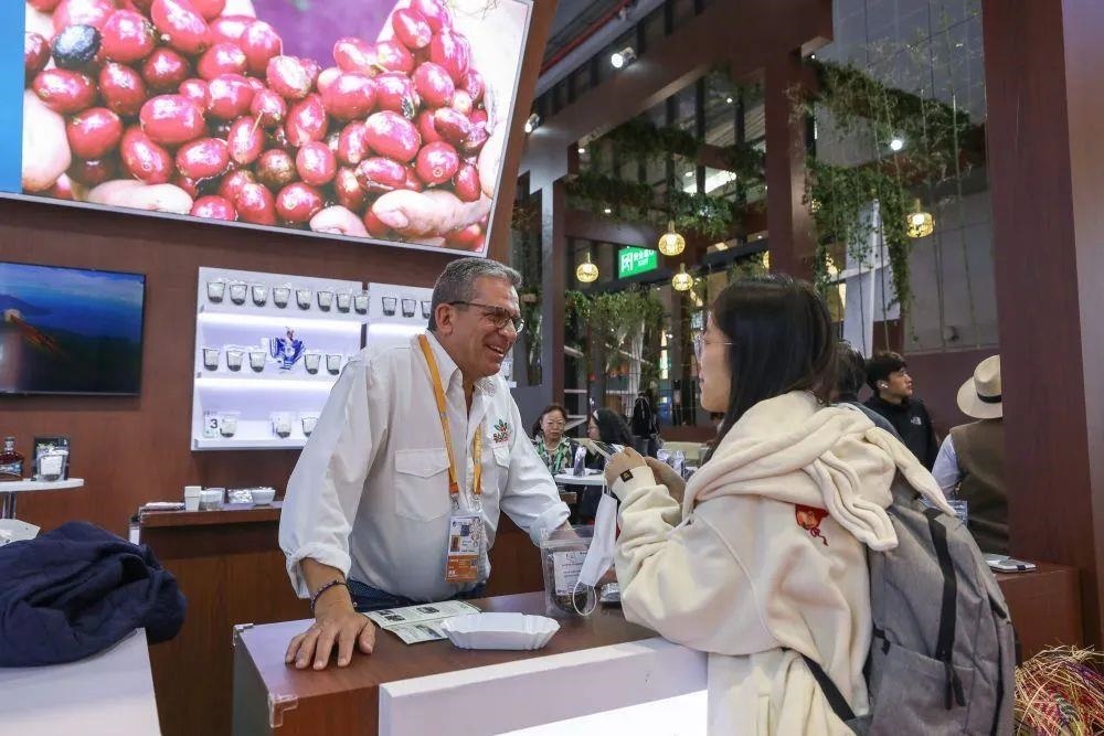 △2024年11月5日,第七屆進博會國家展尼加拉瓜館的工作人員向觀眾介紹商品。