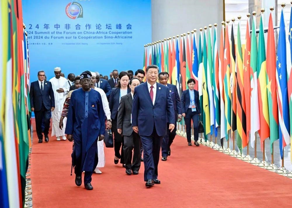 △2024年9月5日,中非合作論壇北京峰會開幕式,習近平主席同外方領(lǐng)導人共同步入會場。