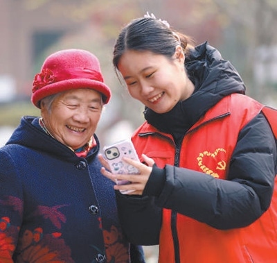 山東省臨沂市郯城縣郯城街道泉悅社區(qū)干部為老年居民介紹智能手機應(yīng)用的使用方法。