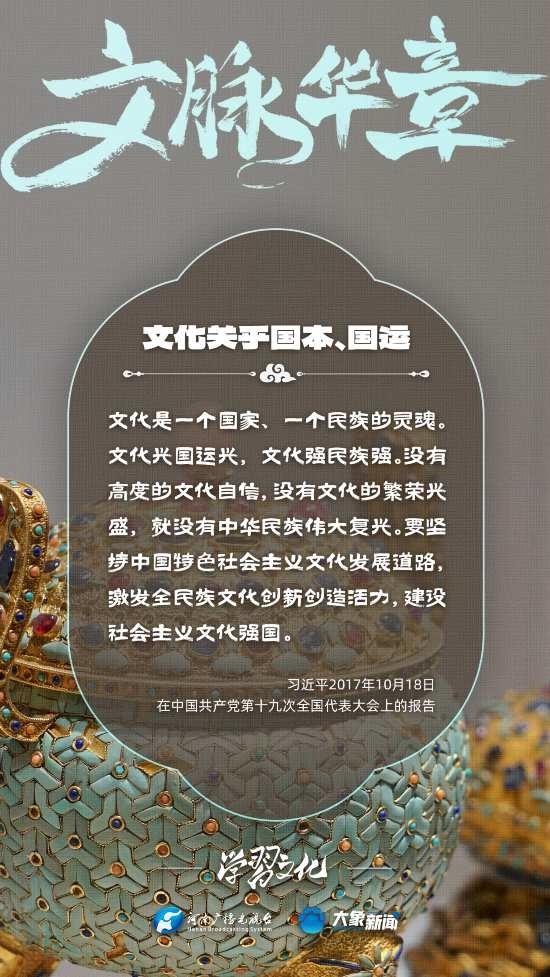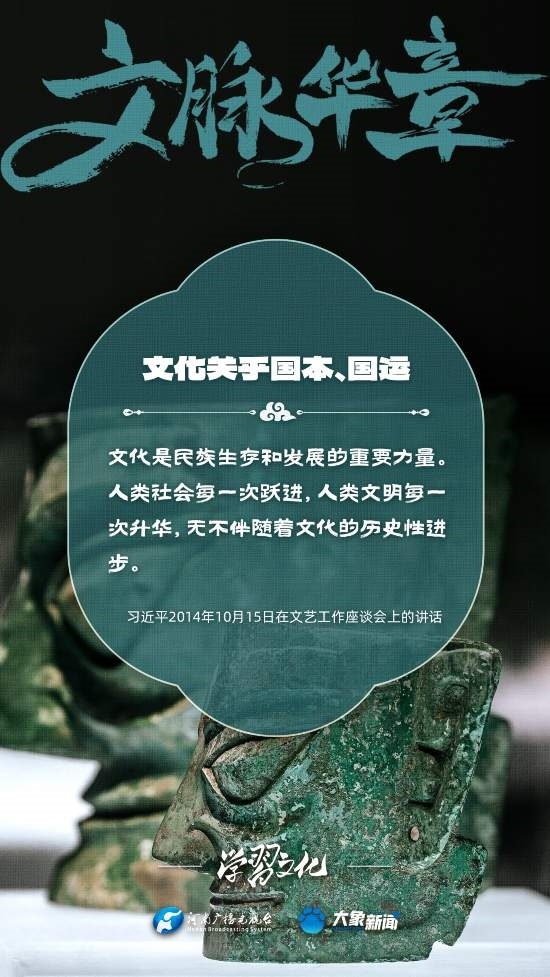 習(xí)近平總書記高度重視文化之于國(guó)家、之于民族的重大意義,強(qiáng)調(diào):文化是一個(gè)國(guó)家、一個(gè)民族的靈魂。文化興國(guó)運(yùn)興,文化強(qiáng)民族強(qiáng)。沒有高度的文化自信,沒有文化的繁榮興盛,就沒有中華民族偉大復(fù)興。大象新聞梳理了習(xí)近平總書記的系列重要論述,我們一起學(xué)習(xí)。