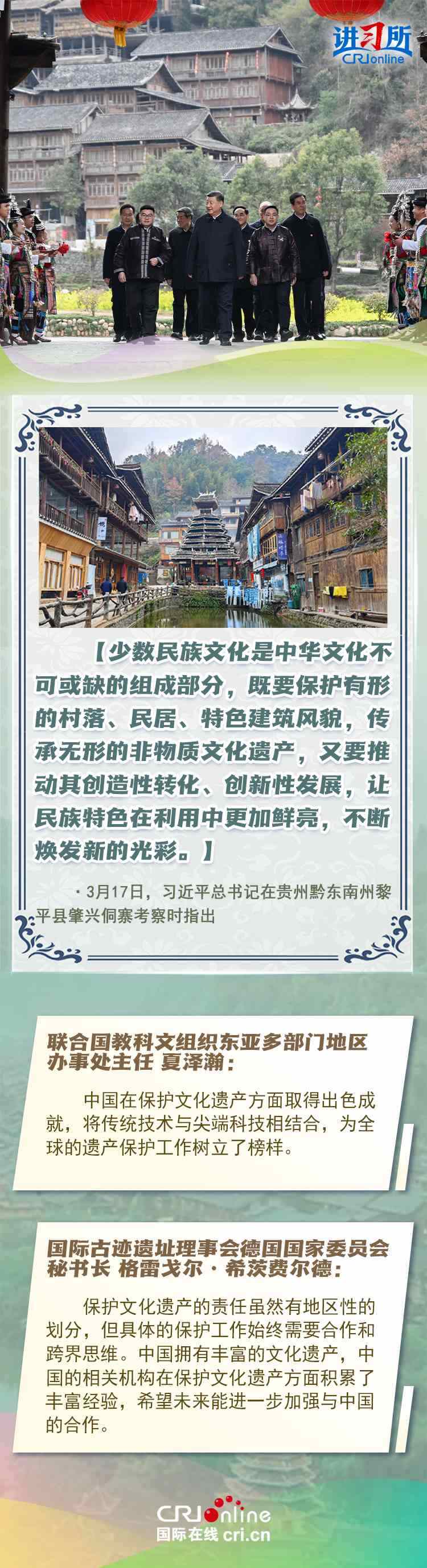 習近平總書記近日赴貴州、云南考察。他走進民族特色村寨、歷史文化古城,心系歷史文化遺產(chǎn)保護和文旅融合發(fā)展。習近平特別叮囑當?shù)毓賳T和群眾,既要保護有形的村落、民居、特色建筑風貌,傳承無形的非物質(zhì)文化遺產(chǎn),又要推動其創(chuàng)造性轉(zhuǎn)化、創(chuàng)新性發(fā)展。