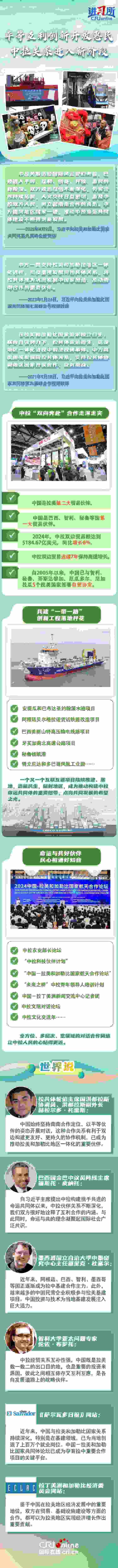 命運(yùn)與共,大道同行。2014年,習(xí)近平主席首次提出構(gòu)建中拉命運(yùn)共同體,為新時(shí)代中拉關(guān)系發(fā)展指明了方向,得到拉美和加勒比國(guó)家積極響應(yīng)。近年來(lái),從就“引領(lǐng)中拉友好關(guān)系駛?cè)胄潞匠獭碧岢鼋ㄗh,到提出新時(shí)代中拉關(guān)系內(nèi)涵,習(xí)近平主席始終著眼于中國(guó)與拉美和加勒比國(guó)家命運(yùn)與共的未來(lái),推動(dòng)中拉關(guān)系穩(wěn)步前進(jìn)。拉美地區(qū)媒體及政學(xué)界人士表示,中國(guó)始終堅(jiān)持南南合作定位,以中拉命運(yùn)共同體理念為指引,持續(xù)推動(dòng)雙邊關(guān)系升級(jí),已成為推動(dòng)拉美和加勒比地區(qū)一體化的重要伙伴。