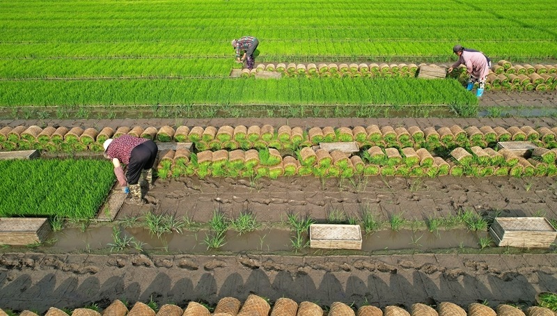 6月18日,在江蘇省海安市墩頭鎮(zhèn)千步村,農(nóng)民起水稻秧苗,準(zhǔn)備進(jìn)行水稻機(jī)插(無人機(jī)照片)。