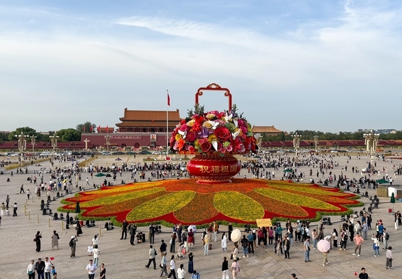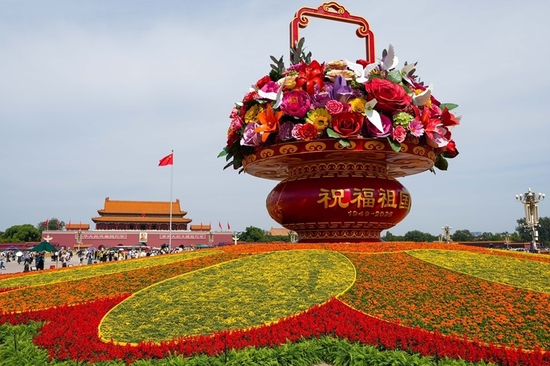 9月25日,2025年“祝福祖國”巨型花籃正式完工,亮相天安門廣場(chǎng)與市民共度佳節(jié)。今年“祝福祖國”花壇以喜慶的花籃為主景,花壇頂高18米,籃體高16米,籃盤直徑12米。籃體南側(cè)書寫“祝福祖國”“1949-2025”字樣,籃體北側(cè)書寫“歡度國慶”“1949-2025”字樣?;@內(nèi)選取了美好寓意的花卉,其中荷花寓意“和和美美”、橄欖枝寓意“榮耀和平”等,還結(jié)合和平鴿元素,體現(xiàn)“和平發(fā)展、欣欣向榮”。