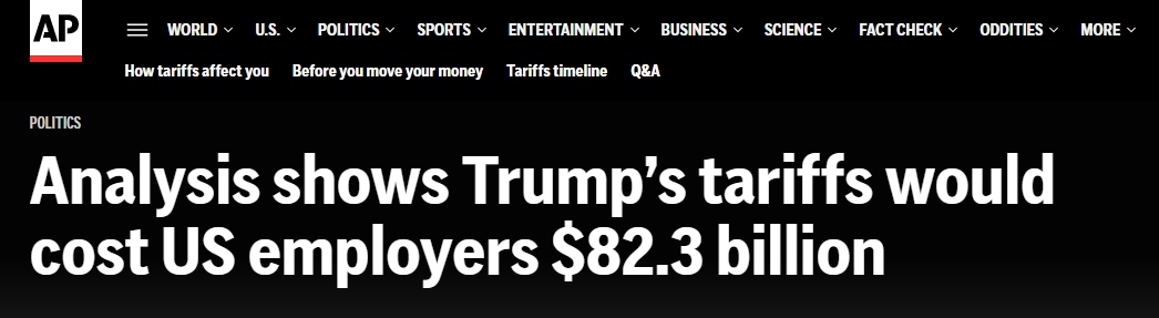 4月份,特朗普政府宣布所謂“對等關(guān)稅”政策后,金融市場出現(xiàn)恐慌。隨后,又設(shè)定了90天談判期,期間多數(shù)進口商品面臨10%基準(zhǔn)稅率。報道稱,若4月2日的初始關(guān)稅維持不變,研究中所涉及的企業(yè)將承受更為高昂的1876億美元的額外成本。若按照現(xiàn)行稅率,823億美元成本平均到每位員工身上就是2080美元,相當(dāng)于年均薪資的3.1%。這一平均值涵蓋了無進口業(yè)務(wù)與有進口業(yè)務(wù)企業(yè)。