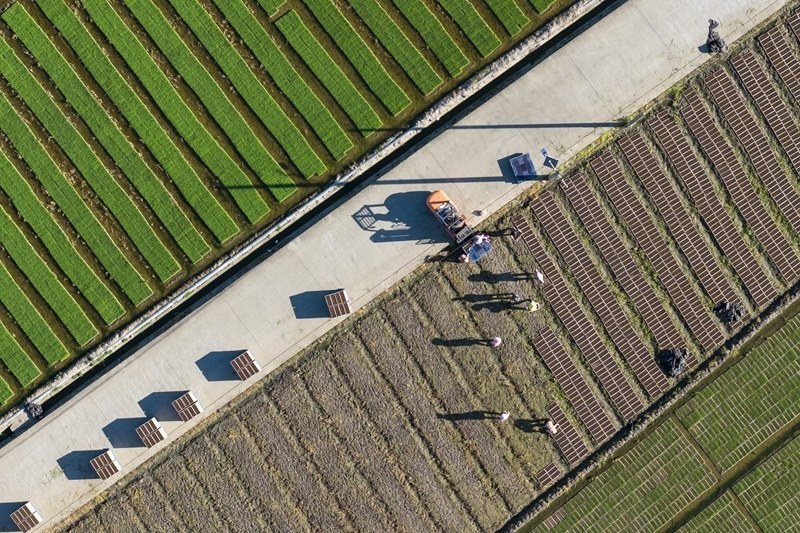 7月7日,浙江省余姚市黃家埠鎮(zhèn)上塘村農(nóng)民在田間擺放晚稻秧盤(無人機照片)。
