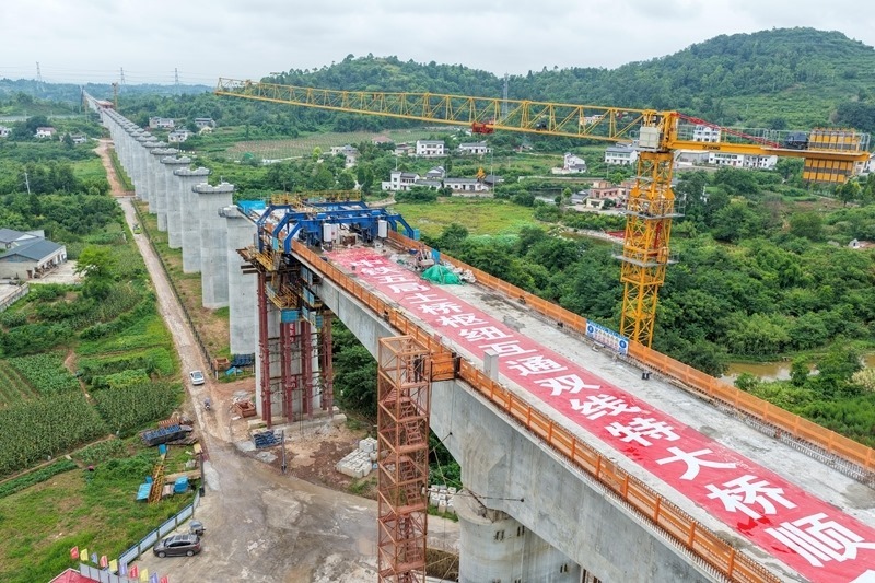 當日,由中鐵五局承建的成渝中線高鐵土橋樞紐互通雙線特大橋連續(xù)梁順利合龍,該連續(xù)梁全長約242米,是成渝中線高鐵重慶段跨度最大的連續(xù)梁。土橋樞紐互通雙線特大橋位于重慶市銅梁區(qū),全長3271.6米,上跨重慶三環(huán)高速及銅安高速公路,共設有92個橋墩,2個橋臺。