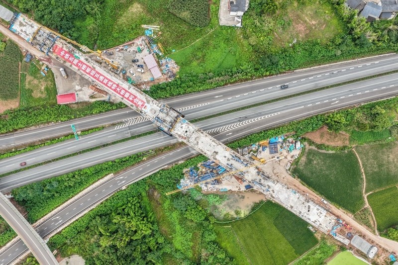 這是7月8日拍攝的成渝中線高鐵土橋樞紐互通雙線特大橋建設現(xiàn)場(無人機照片)。