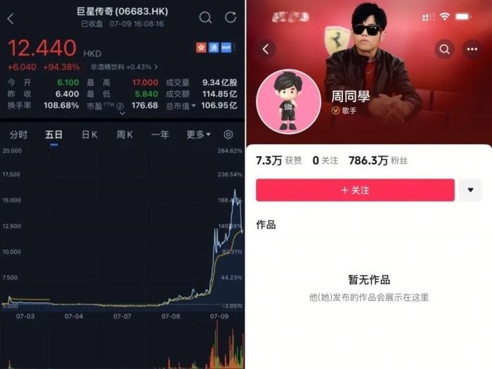 7月9日,周杰倫宣布入駐抖音平臺,賬號以其官方二次元IP形象“周同學(xué)”命名,頭像也是“周同學(xué)”IP化身,認(rèn)證身份為歌手。受該消息的提振,“周杰倫概念股”巨星傳奇(6683.HK)9日收漲94.37%,收盤價為12.44港元,總市值106.95億港元,單日成交量9.34億股,成交額達114.85億港元;盤中一度拉升漲165.62%,兩個交易日暴漲146.34%。