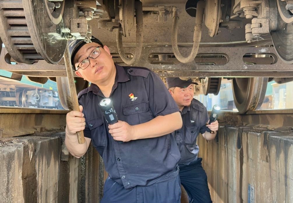 只見他俯下身鉆入車底,仔細檢查車輛的轉(zhuǎn)向架、制動裝置等關(guān)鍵部位。車底空間狹小、光線不足,許立業(yè)需借助手電筒弓著腰作業(yè),不一會兒,汗水就浸濕了工作服。為了預(yù)防中暑,他掏出一瓶藿香正氣水,一口氣喝完,然后擦了擦臉上的汗水,繼續(xù)朝下節(jié)車廂走去。