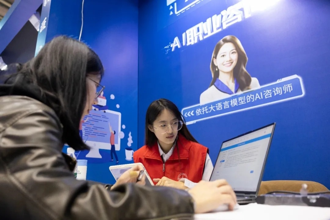 3月26日,在哈爾濱工業(yè)大學(xué)一校區(qū)體育館內(nèi),學(xué)生在體驗(yàn)AI職業(yè)咨詢。張濤 攝