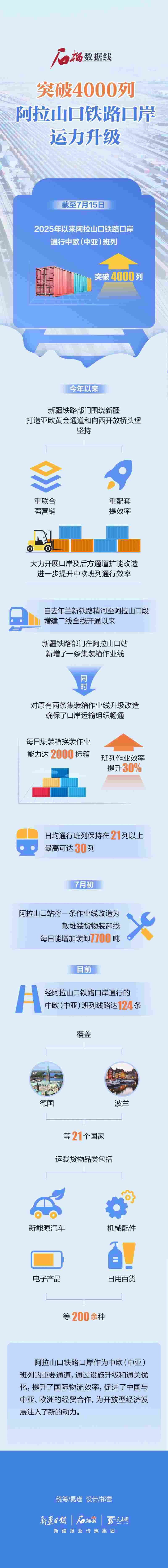 截至7月15日,2025年以來阿拉山口鐵路口岸通行中歐(中亞)班列突破4000列。