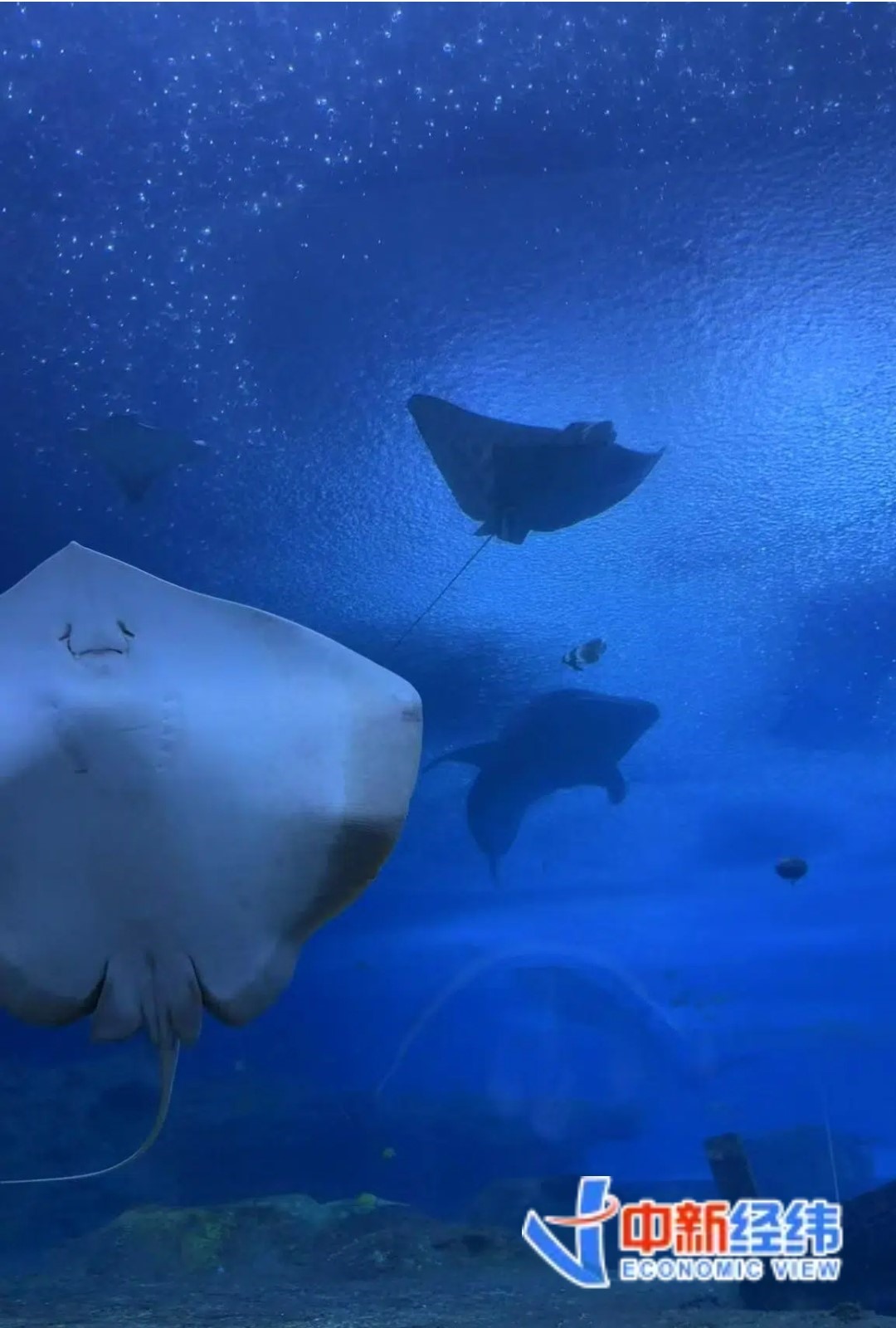 在海底區(qū),小林感到自己仿佛來到了海底世界的IMAX影廳,抬頭就能看到各種海底生物在頭上游過。晚上工作人員還會撤去警戒線,讓他們能與動(dòng)物更加貼近?!澳莻€(gè)時(shí)候的體驗(yàn),就是‘藍(lán)調(diào)時(shí)刻’,幽靜又神秘,抬頭就能看到鯨鯊巨物從頭頂游過。夜深一些,還能看到有小魚沉底睡覺休息?!毙×终f道。