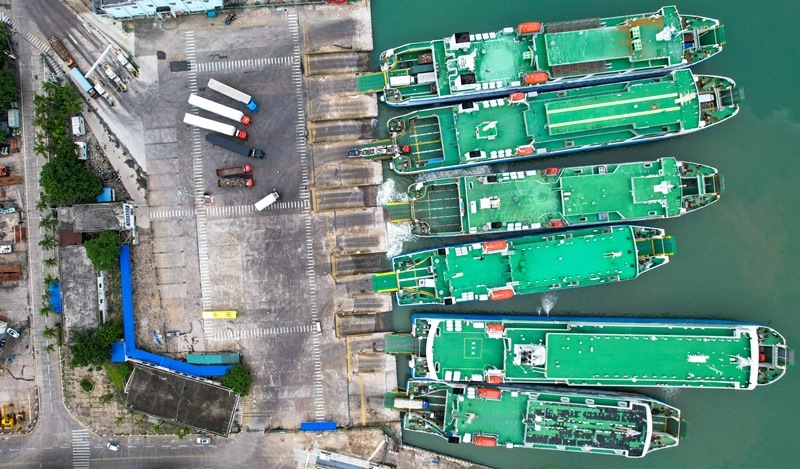 7月22日,在??谑行阌⒏?,車輛有序駛入客滾船(無人機照片)。