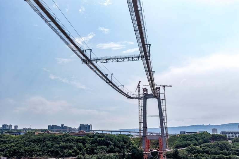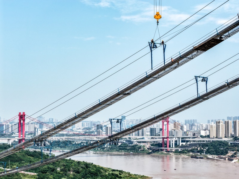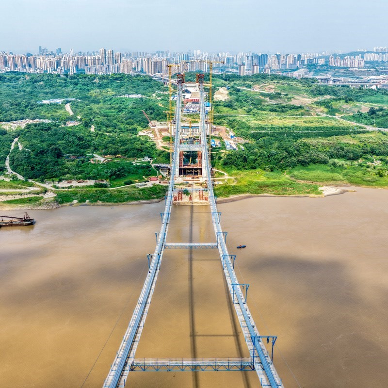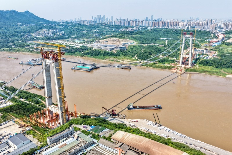 當日,由重慶城投集團投資、城投建設公司組織建設、中國鐵建大橋局承建的黃桷沱長江大橋順利完成主纜架設工作,標志著大橋建設即將進入鋼桁梁吊裝工序。黃桷沱長江大橋全長1260米,主跨765米,為單跨懸吊雙塔三跨連續(xù)鋼桁梁懸索橋,是國內最大跨徑公軌兩用懸索橋。黃桷沱長江大橋是渝長高速復線連接道工程的控制性節(jié)點工程,建成后將成為聯(lián)系重慶主城區(qū)長江南北兩岸的重要交通干道。