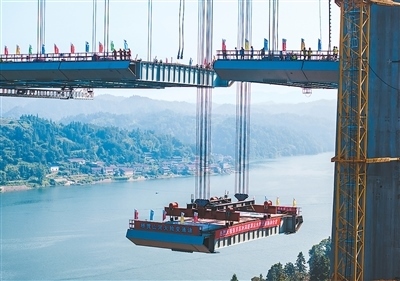 8月3日,由湖南路橋建設(shè)集團承建的張官高速控制性工程洞庭溪沅水特大橋主橋順利合龍,為2026年全線通車奠定堅實基礎(chǔ)。張官高速公路北起張家界市永定區(qū),南至懷化市沅陵縣官莊鎮(zhèn),是國家高速公路網(wǎng)呼和浩特—北海高速公路的重要組成部分。圖為大橋施工現(xiàn)場,一塊鋼混結(jié)合梁在被緩緩提升。新華社記者 陳思汗攝