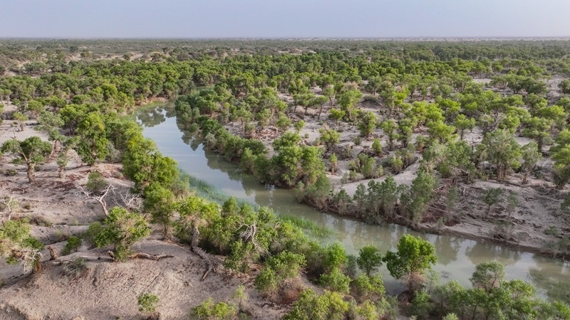 8月6日,在新疆巴音郭楞蒙古自治州尉犁縣境內(nèi)拍攝的胡楊林(無人機(jī)照片)。