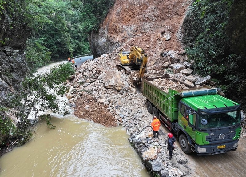8月10日,在??悼h馬橋鎮(zhèn)堯(治河村)馬(橋鎮(zhèn))路6.2公里處,大型工程機械處置路旁崩塌的巖石。