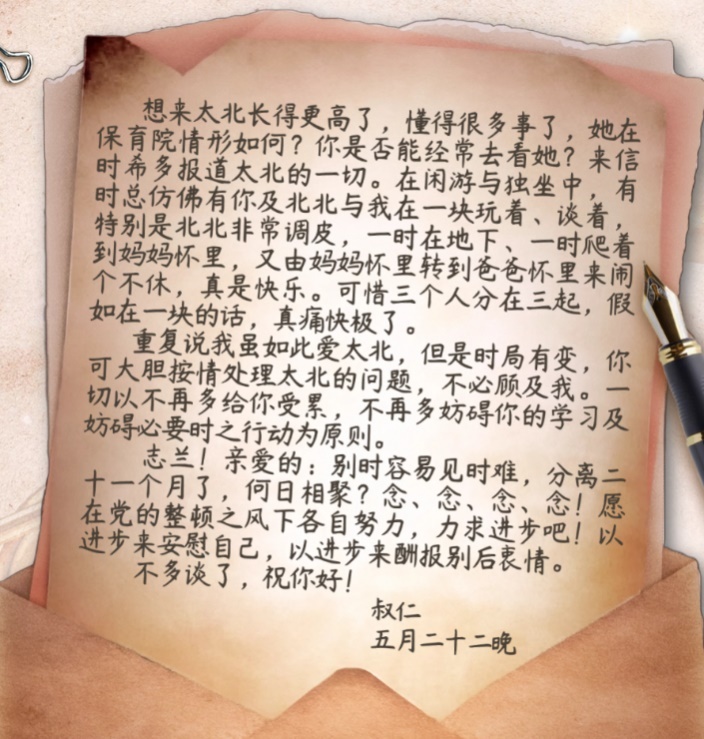在信的最后,左權不得不忍痛交代妻子:“我雖如此愛太北,但是時局有變,你可大膽按情處理太北的問題,不必顧及我?!辈⒚銊钇拮右赃M步來安慰自己,以進步來酬報別后衷情。