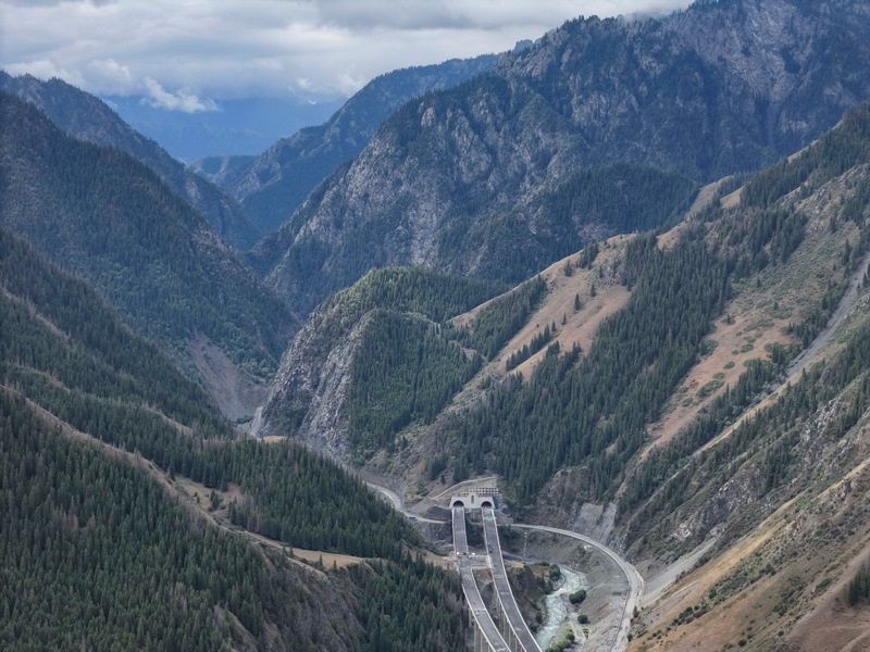 新疆烏尉高速公路穿越天山山脈(8月19日攝,無人機全景照片)。